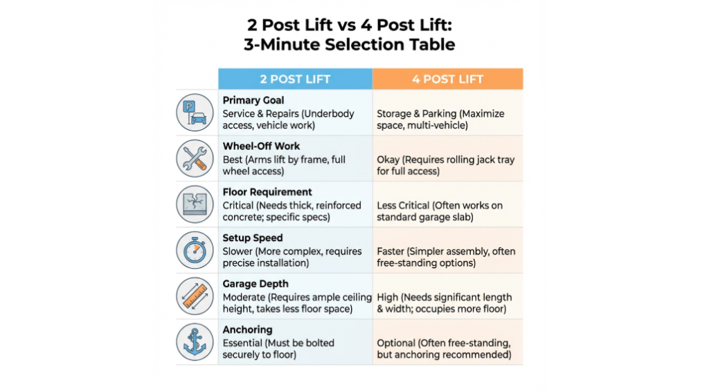 For 2 Post Lift vs 4 Post Lift, match the lift to your “80% task,” then confirm your space, floor, and ceiling before you buy.